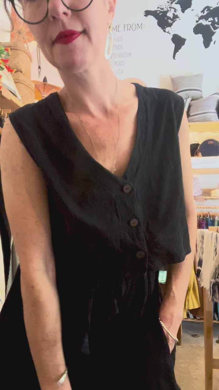 Our own, Dear Friend, boxy top that can be worn 3 ways. Rock this top as a v-neck button up, reversed for high neck in front with button details at back, or open as a casual vest. Because variety is the spice of life!