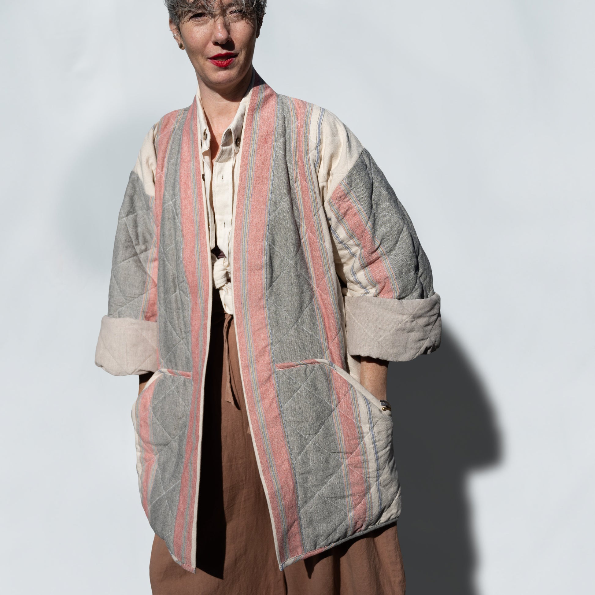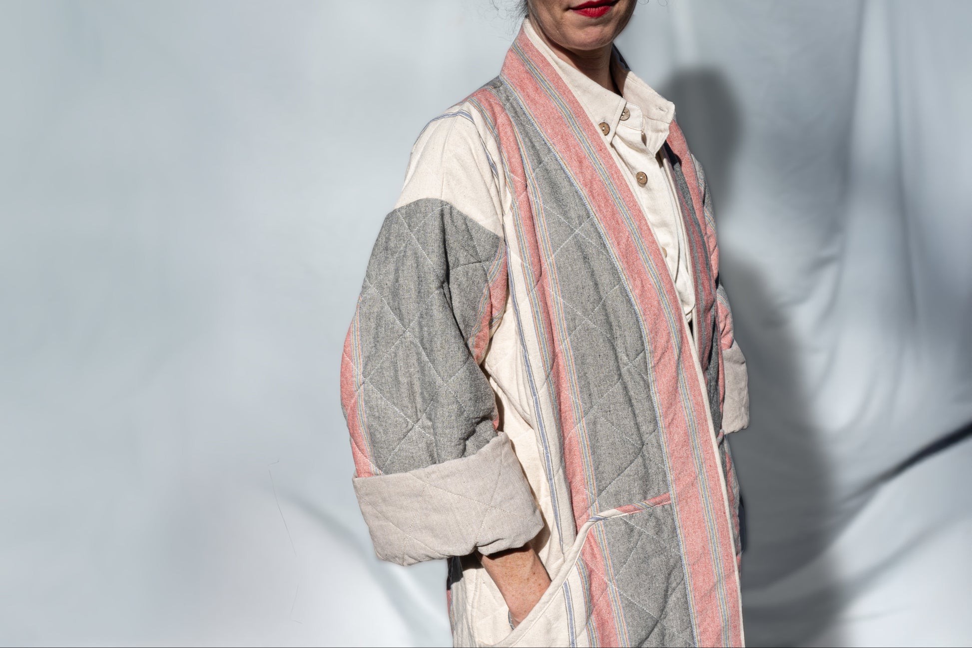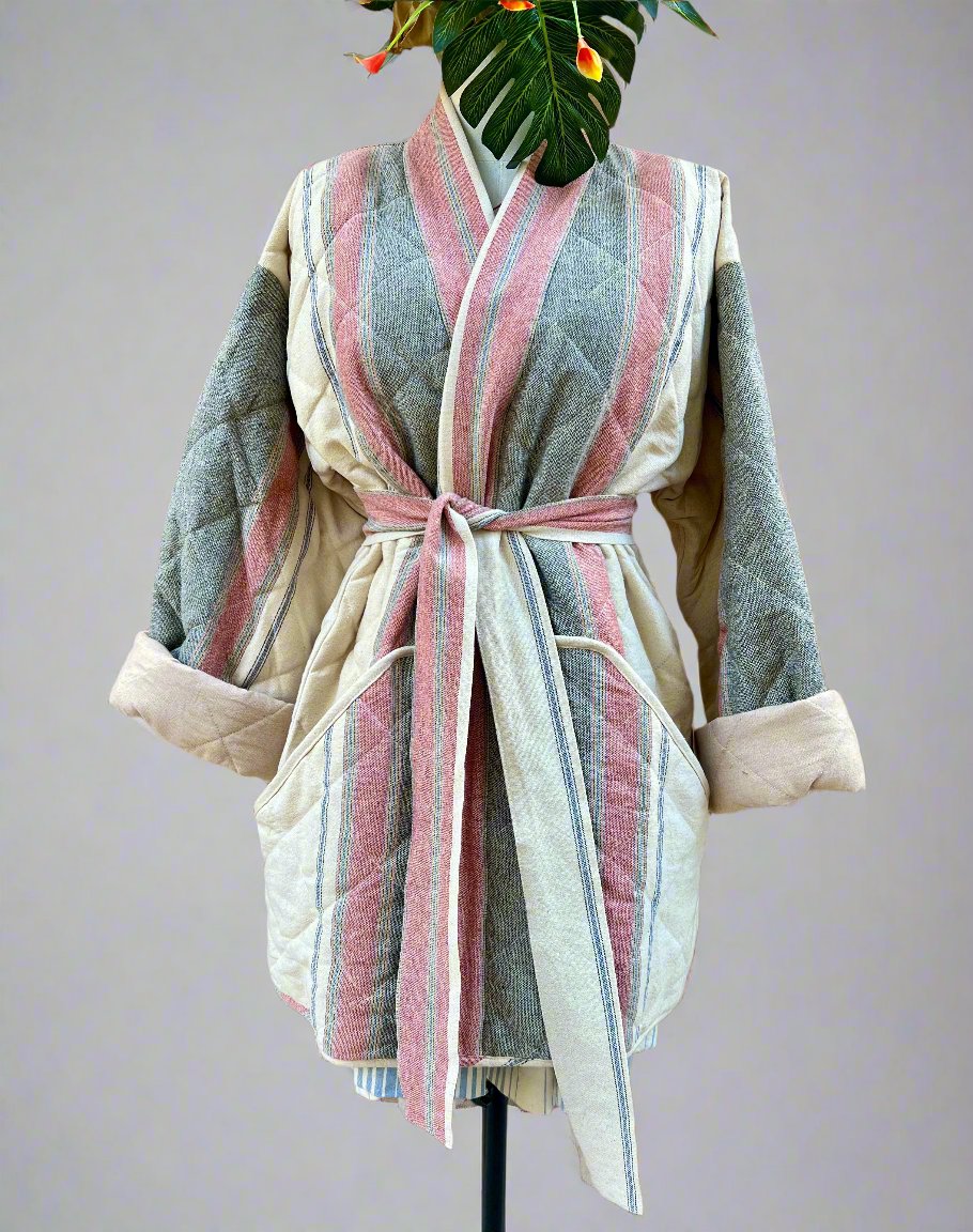 Our own, Dear Friend, quilted jacket, thoughtfully designed in Austin, Texas, and ethically handcrafted in Kathmandu, Nepal. Unisex and Free Size because every body is unique and will look unique in any size! These super cozy jackets can be worn open and loose, or belted up with the accompanying sash, for extra warmth. We sometimes belt it with stockings & heels for a cozy winter dress. And, of course, they have extra deep pockets for necessary comfort.