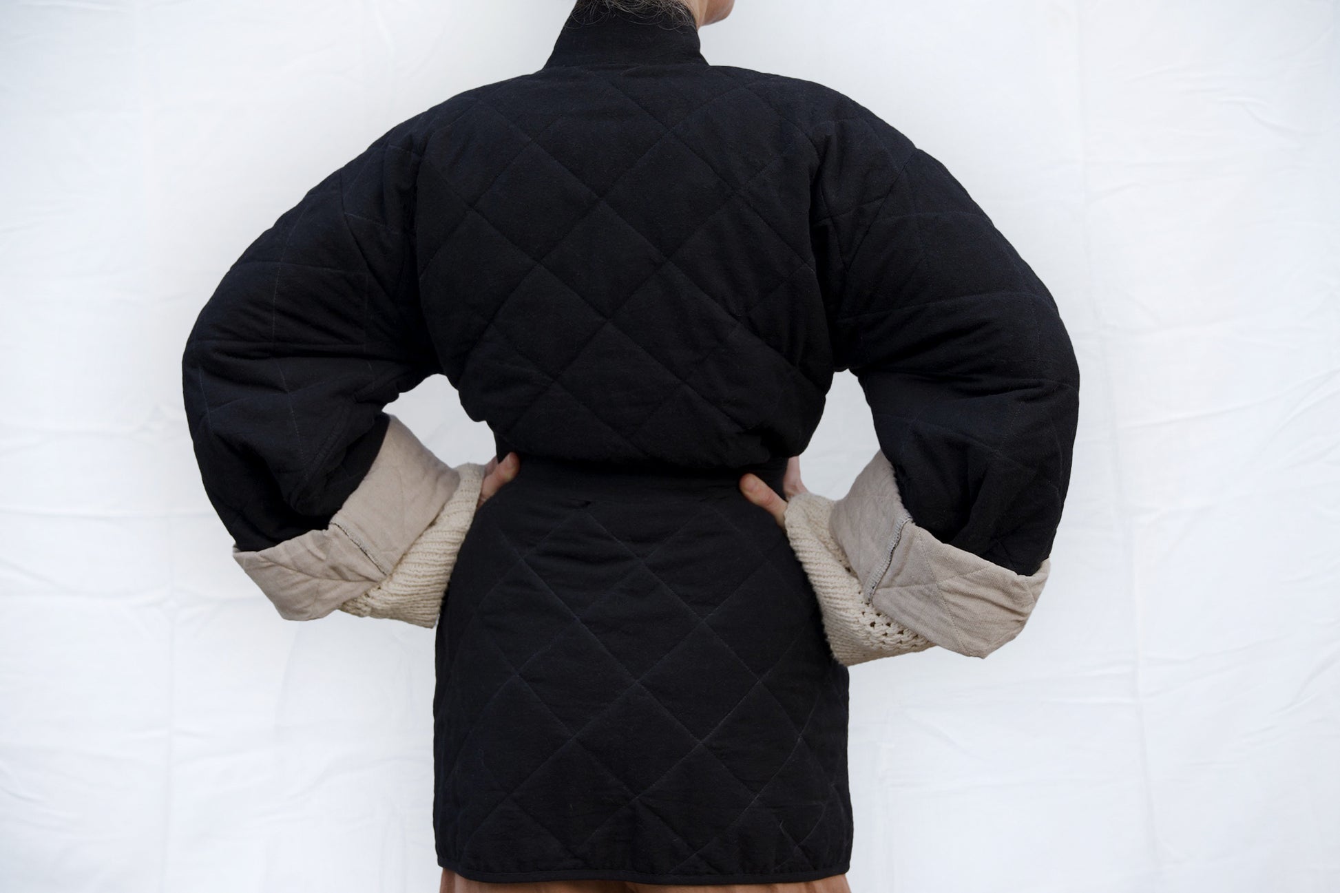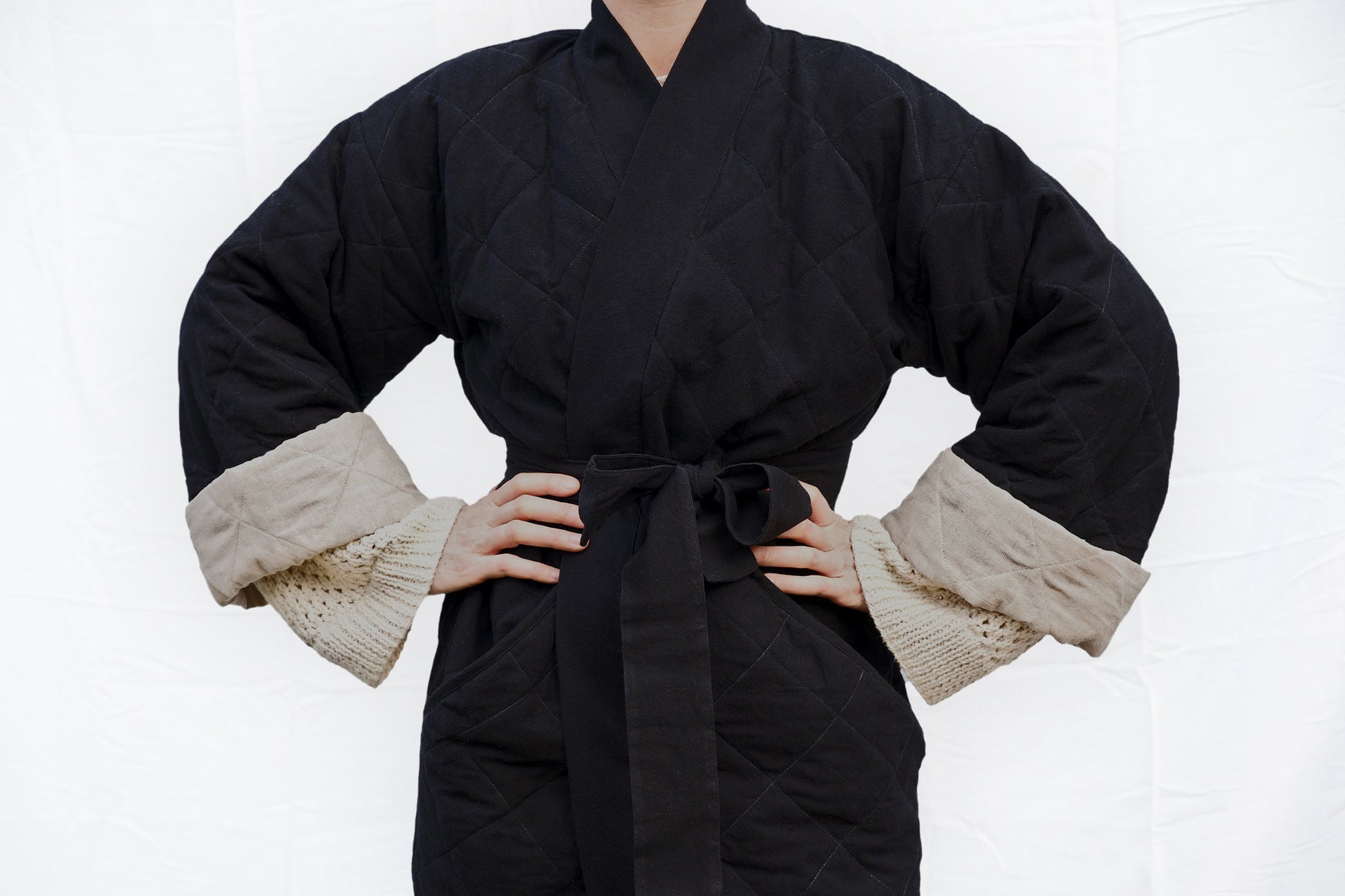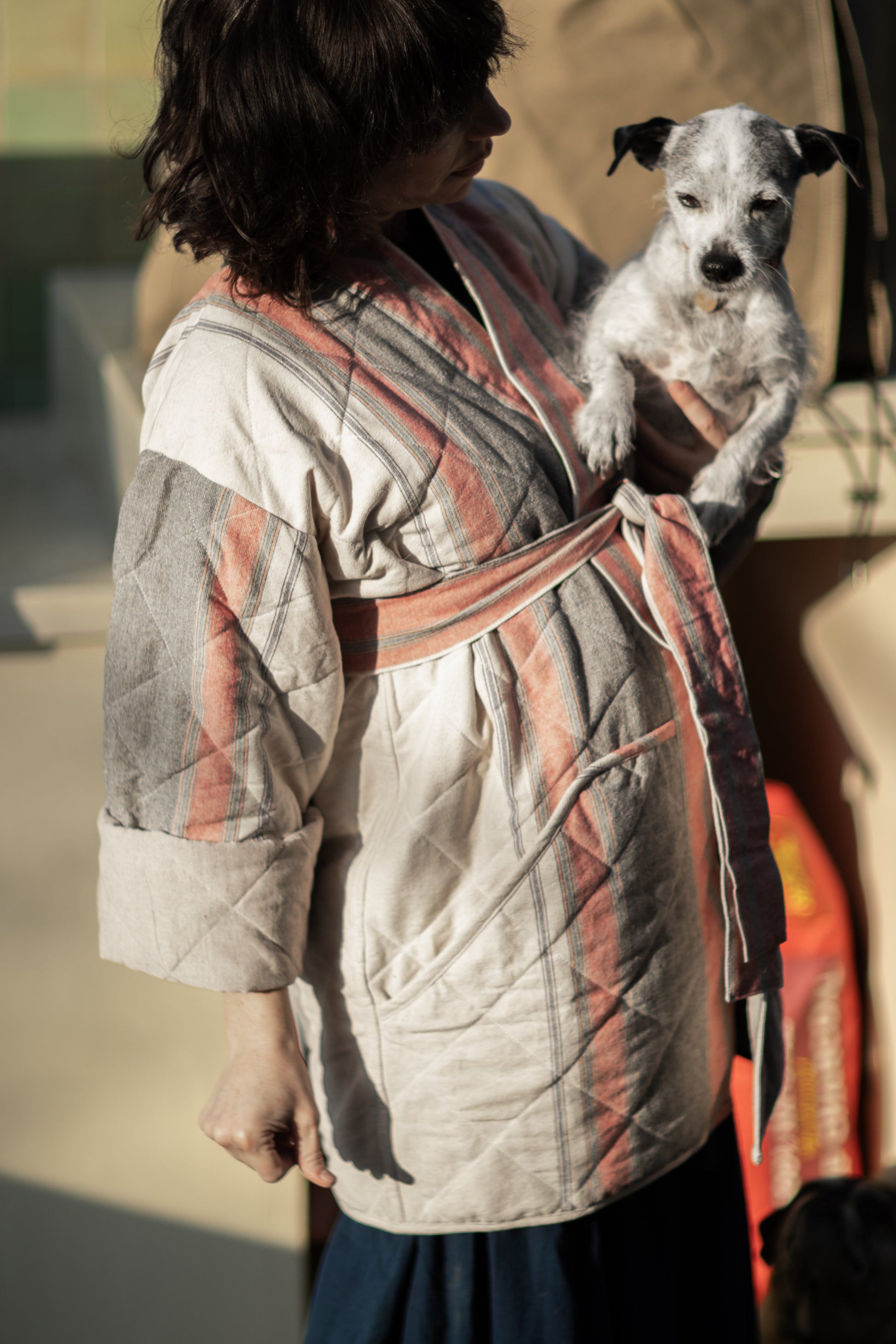 Our own, Dear Friend, quilted jacket, thoughtfully designed in Austin, Texas, and ethically handcrafted in Kathmandu, Nepal. Unisex and Free Size because every body is unique and will look unique in any size! These super cozy jackets can be worn open and loose, or belted up with the accompanying sash, for extra warmth. We sometimes belt it with stockings & heels for a cozy winter dress. And, of course, they have extra deep pockets for necessary comfort.